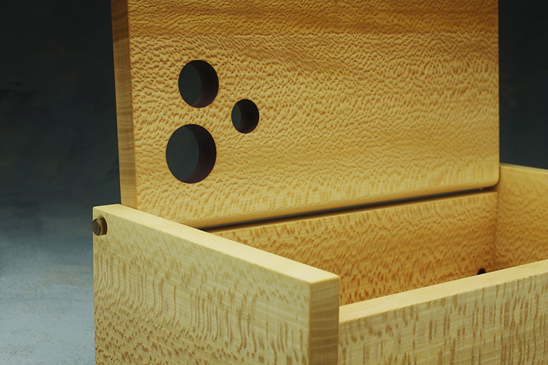 All the wood used in the box came from a single plank — the sides, the bottom panel and the lid. The box body was constructed using traditional mortise and tenon joinery. Each side of the box was cut sequentially from the plank so that the grain flows harmoniously around the corners. I made the bottom out of solid sycamore, rather than plywood used for most boxes. To make the bottom, I sliced a thick piece of sycamore into two thinner pieces. One piece was used for the lid and the other was used for the bottom. I selected this particular part of the plank for the lid and bottom because I liked the contrasting colors in the wood. To embellish the box, I created circles in the sides and lid and painted them with milk paint custom blended for this project. The pattern of the circles makes me think of some sort of fizzy drink so I named this box ‘Bubbly.’ The final shaping of the box body and lid was done by hand. I prefer to do the final contouring, rounding over of sharp edges, etc., by hand. This is when I can get up close and personal with the wood and see its beautiful grain emerge as I sand with finer and finer grit sandpapers. I also like the slight variations that tell you this item is crafted by hand rather than made impersonally, at a distance, with power tools. Finally, I finished the box by saturating it with three coats of ‘Tried and True’ wood finish and hand rubbed it to a soft luster. The pivot hinges in the lid and the handle are glass.