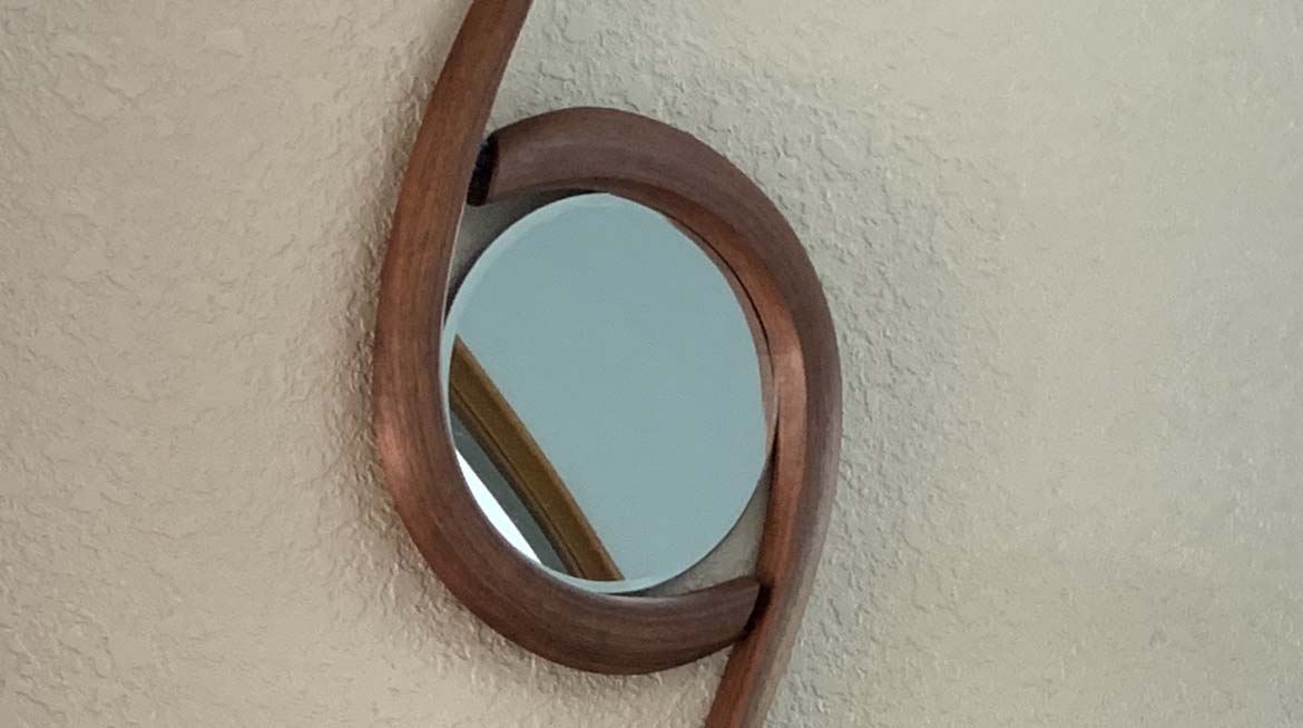 I had actually designed this particular mirror several years before but never made it. Due to the nature of my design process I generate several viable ideas for any given project. Because I only build one of those ideas I am left with lots and lots of other good ideas in my sketchbook looking for the right opportunity. The bench provided the perfect opportunity for this particular design. I wanted to compliment the horizontal nature of the bench with a mirror that was strongly vertical in nature. Also, the sweeping curves and kinetic feel to the mirror echoed the curves of the bench seat and kinetic feel of the bench stretchers.